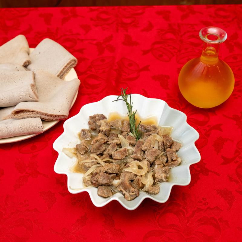 Dried strips of beef mixed with injera in a deliciously seasoned sauce.