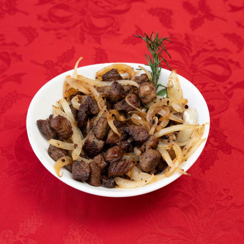 Pan roasted strips of beef simmered with onion, butter, non-spice.